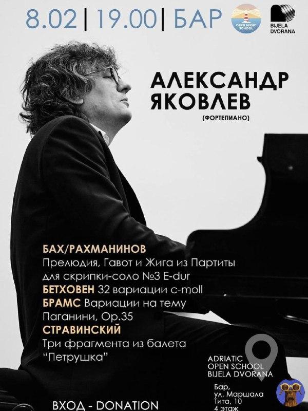 Фортепианный концерт Александра Яковлева в Баре 📅 Вс, 8 февраля в 19:00 Александр Яковлев — пианист, чьё исполнительское искусство отличает…