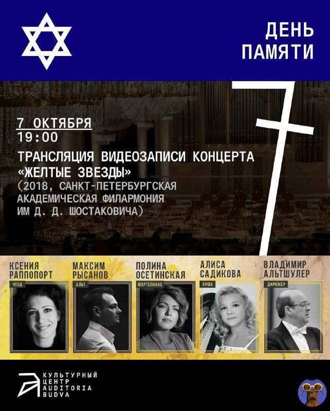 Во вторник, 7 октября в 19:00, в Будве состоится трансляция видеозаписи концерта «Желтые звезды» Санкт-Петербургской академической филармонии им. Д. Д. Шостаковича (2018) в годовщину трагических событий 7 октября.