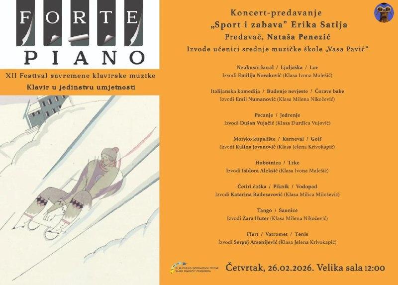 ◆ В 12:00 — концерт-лекция «Спортивные игры и дивертисменты» Эрика Сати: цикл коротких пьес представят пианистка и педагог Наташа Пенезич вместе с учениками фортепианного отделения школы искусств Vasa Pavić.