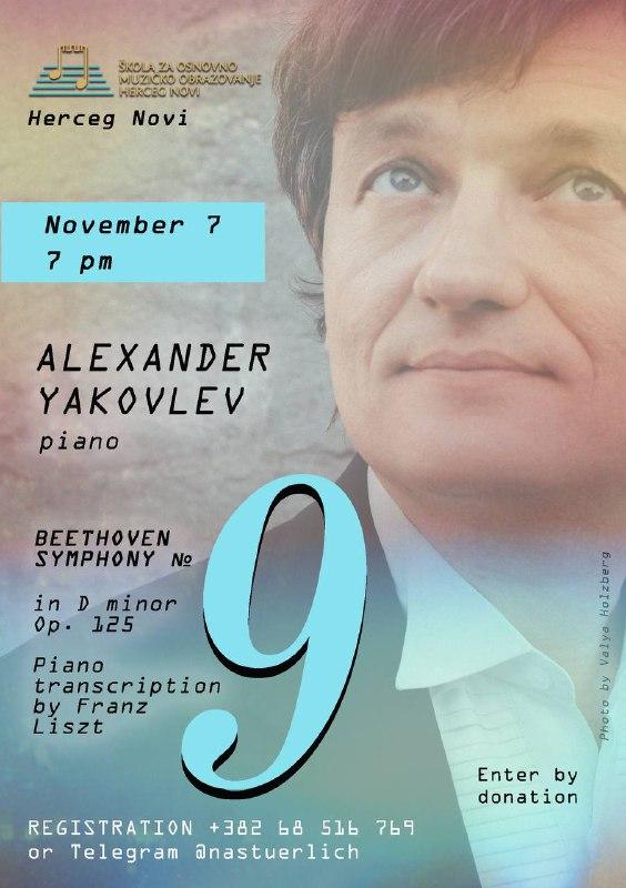 Приглашаем вас провести вечер пятницы в компании Бетховена, Листа и пианиста Александра Яковлева, который выступит в качестве проводника трансцендентальной информации, заложенной Бетховеном в грандиозную Девятую симфонию. На сцене не будет ни хора, ни солистов, ни оркестра, но пианист сделает всё, чтобы вы услышали, что они есть.