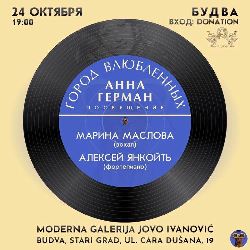 В пятницу, 24 октября в 19:00, в Будве певица Марина Маслова и пианист Алексей Янкойть ждут вас на концерт «Город влюбленных», посвященный жизни и творчеству певицы Анны Герман.