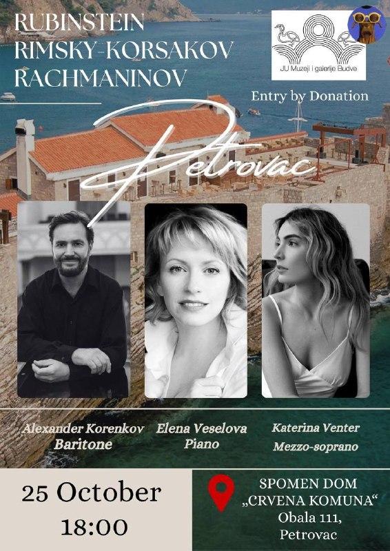 🎵 В этот вечер прозвучат знаменитые романсы и арии из опер русских композиторов в исполнении лауреатов международных конкурсов — баритона Александра Коренкова, меццо-сопрано Екатерины Вентер и пианистки Елены Веселовой.
