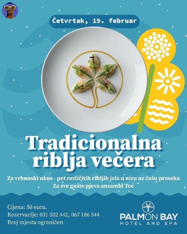 В четверг, 19 февраля в 20:00, в Херцег-Нови пройдет Tradicionalna riblja večera — рыбный ужин из пяти блюд с бокалом просекко и живым вокалом.