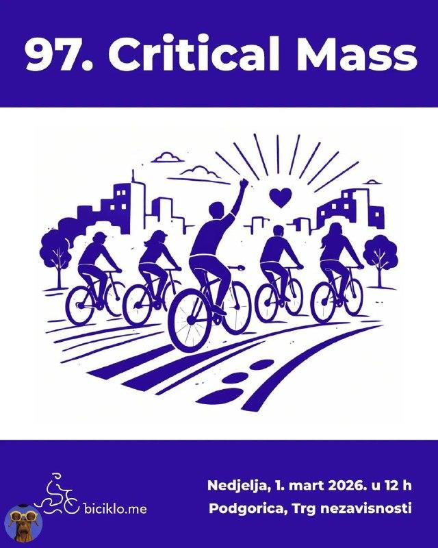 В воскресенье, 1 марта в 12:00, в Подгорице пройдет 97-й Critical Mass — совместная велопрогулка по городским улицам в поддержку велосипеда как одного из решений для комфортного и экологичного городского транспорта.